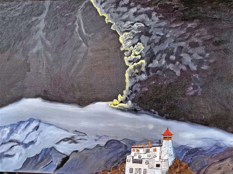 推開羽芊位于拉薩東郊的家門,目光首先被三面通體書墻溫柔捕獲。文學(xué)、歷史、自然、科學(xué),上萬冊藏書如沉默的智者靜立。書柜一角,整齊擺放著《藏婚》《西藏生死戀》《金城公主》等十五部藏地題材作品,每一本都浸潤著高原陽光的暖意。四處打量,書桌旁立著一個畫架,未完成的油畫上,藏北草原斑斕秋色正流淌在畫布上,透露出她對光影與色彩天生的敏銳——這份未被刻意強調(diào)的油畫天賦,悄然浸染著她的文學(xué)世界。