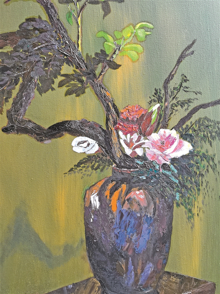 羽芊的畫作《老瓶與玫瑰》。