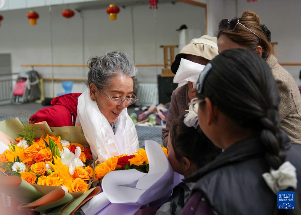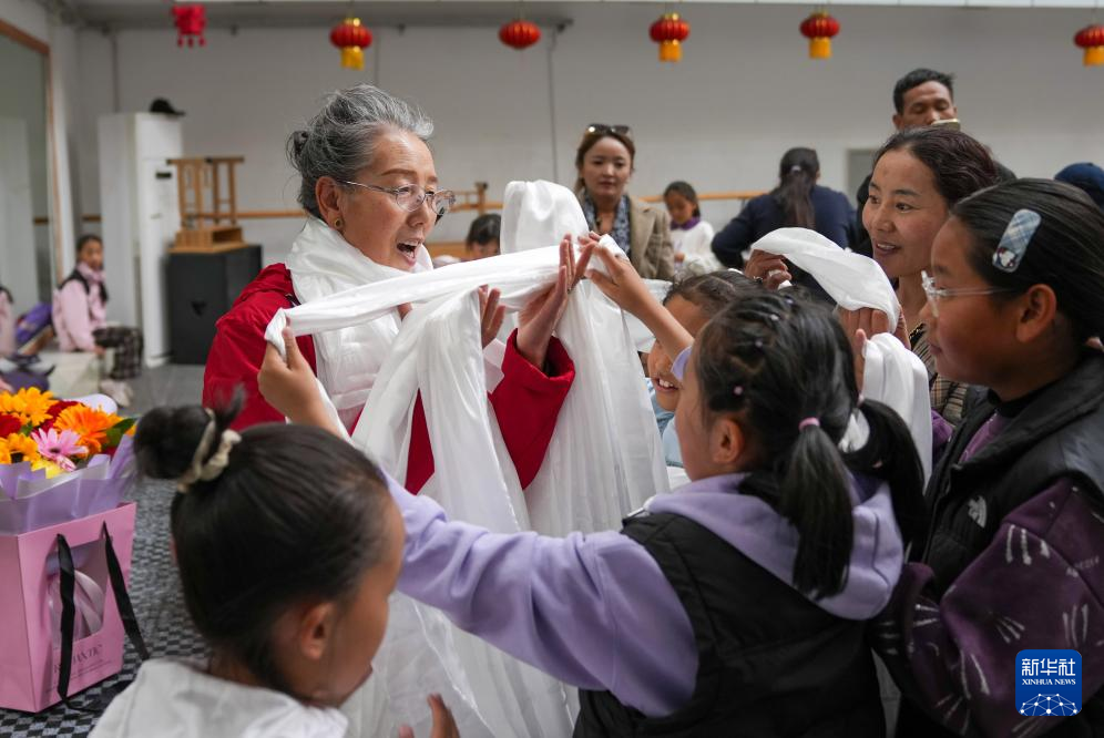 9月14日,學(xué)藏戲的孩子們在給巴桑老師獻(xiàn)花,送上遲到的教師節(jié)祝福。新華社記者 晉美多吉 攝