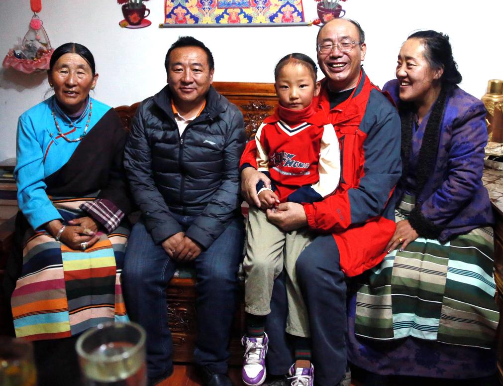 這是唐召明(右二)作為北京建藏援藏工作者協(xié)會志愿者到藏北草原向牧民群眾捐贈撿拾牛糞的高原撿拾車時,前去看望次仁石達(左二)一家,并與次仁石達的女兒小拉姆(中)以及阿媽達曲(左一)合影留念(王博軒2019年9月9日攝)