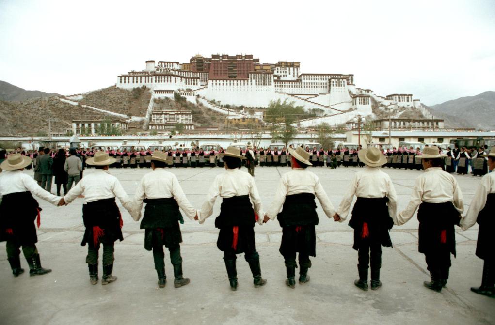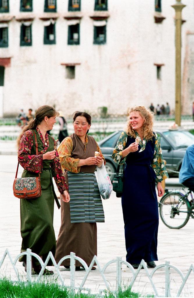 在拉薩市布達拉宮前,兩位身著藏裝的外國游客和一位藏族婦女交談。交通和旅游服務(wù)設(shè)施的逐步完善,為獨具風(fēng)情的西藏高原引來了更多的游客。(1997年11月13日發(fā))