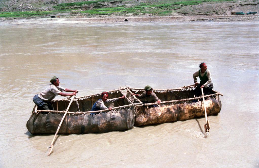 雅魯藏布江上擺渡的牛皮筏。這是在西藏常見的一種水上運輸工具,用幾張整牛皮縫在一起制成。(1997年11月28日發(fā))
