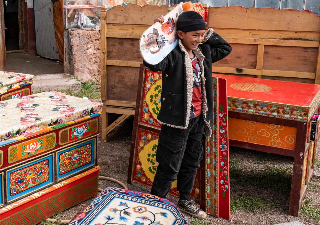 雙湖縣多瑪鄉(xiāng)仲魯瑪村的一個小朋友拿著自己心愛的滑板,準(zhǔn)備搬去新家(2022年7月13日攝)。新華社記者 孫非 攝