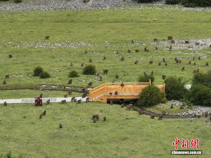 圖為林則村的林則生態(tài)文化旅游景區(qū)里的藏獼猴。(無(wú)人機(jī)照片)中新社記者 貢嘎來(lái)松 攝