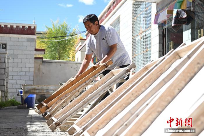 圖為尼木雪拉藏紙農(nóng)牧民專業(yè)合作社負(fù)責(zé)人格桑旦增在檢查藏紙的質(zhì)量。中新社記者 貢嘎來松 攝
