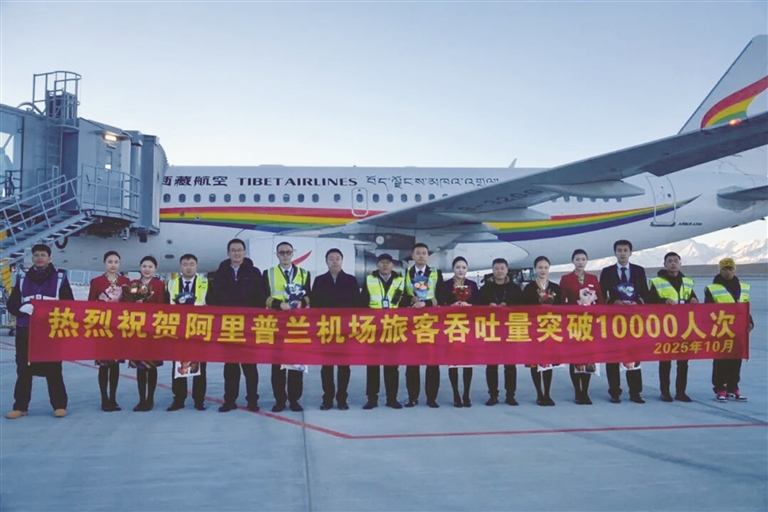 10月20日,西藏航空TV9705航班平穩(wěn)降落在阿里普蘭機(jī)場(chǎng),作為阿里普蘭機(jī)場(chǎng)2025年第10000名旅客,乘客果果在工作人員的掌聲中走下飛機(jī),接受機(jī)場(chǎng)工作人員敬獻(xiàn)的哈達(dá)和鮮花。這一刻,是阿里普蘭機(jī)場(chǎng)實(shí)現(xiàn)年旅客吞吐量“從千到萬(wàn)”的歷史性跨越。