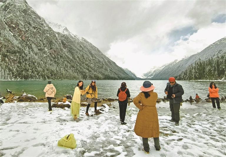 林芝市工布江達(dá)縣新錯湖畔,游客在雪景中打卡留念,盡享高原湖光山色。記者 次仁平措 攝