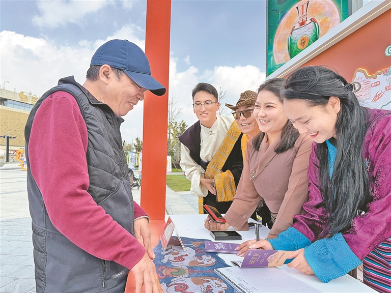 “萬人墨竹探親游”活動(dòng)的探親證發(fā)放處人潮擁擠,排隊(duì)申請(qǐng)領(lǐng)證的市民絡(luò)繹不絕?!拔覀儨?zhǔn)備了1萬本免費(fèi)發(fā)放的探親證,探親證上詳細(xì)介紹了紅色文化游、藍(lán)色康養(yǎng)游、綠色生態(tài)游、文化探秘游、墨竹深度游精品線路的詳細(xì)內(nèi)容供大家選擇。屆時(shí),我們將準(zhǔn)備好香甜的青稞酒、潔白的哈達(dá)、美味的藏餐等候咱們南京的兄弟姐妹回雪域高原的墨竹家中看看、坐坐?!蹦窆たh文化旅游公司負(fù)責(zé)人扎西措姆在探親證發(fā)放現(xiàn)場(chǎng)介紹道。