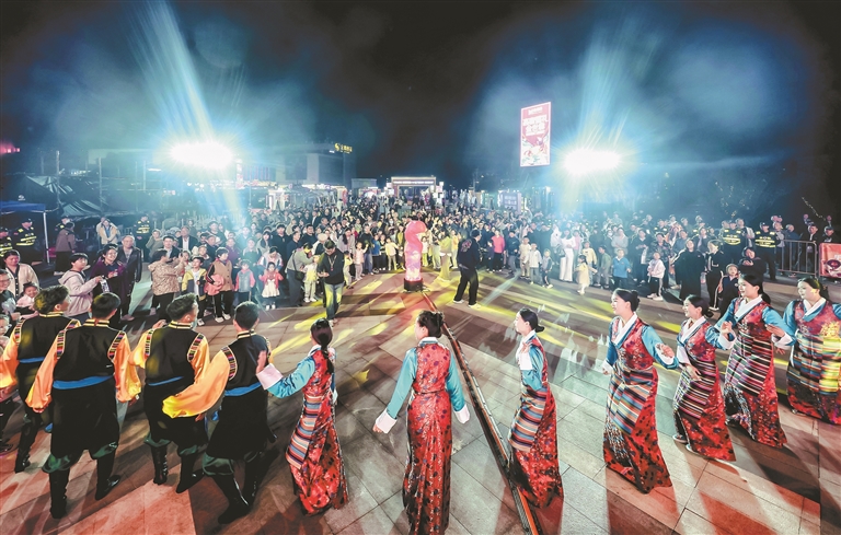 圖為萬人鍋莊晚會(huì)現(xiàn)場(chǎng),南京市民與墨竹工卡縣松贊藝術(shù)團(tuán)演職人員一起跳鍋莊。