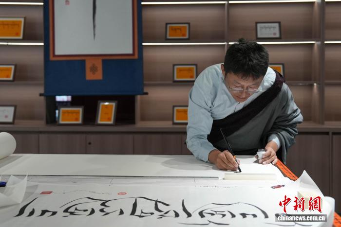 圖為西藏鄉(xiāng)村振興產(chǎn)品展示中心內(nèi)的藏文書法體驗(yàn)區(qū)。貢確 攝