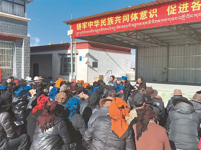 圖為央金(前排中)向村民宣講如何鑄牢中華民族共同體意識。林周融媒提供