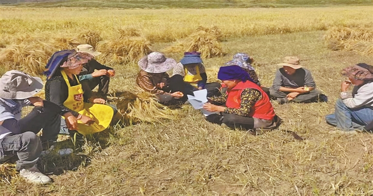 圖為央金(右三)在田間地頭向村民宣講惠民政策。林周融媒提供
