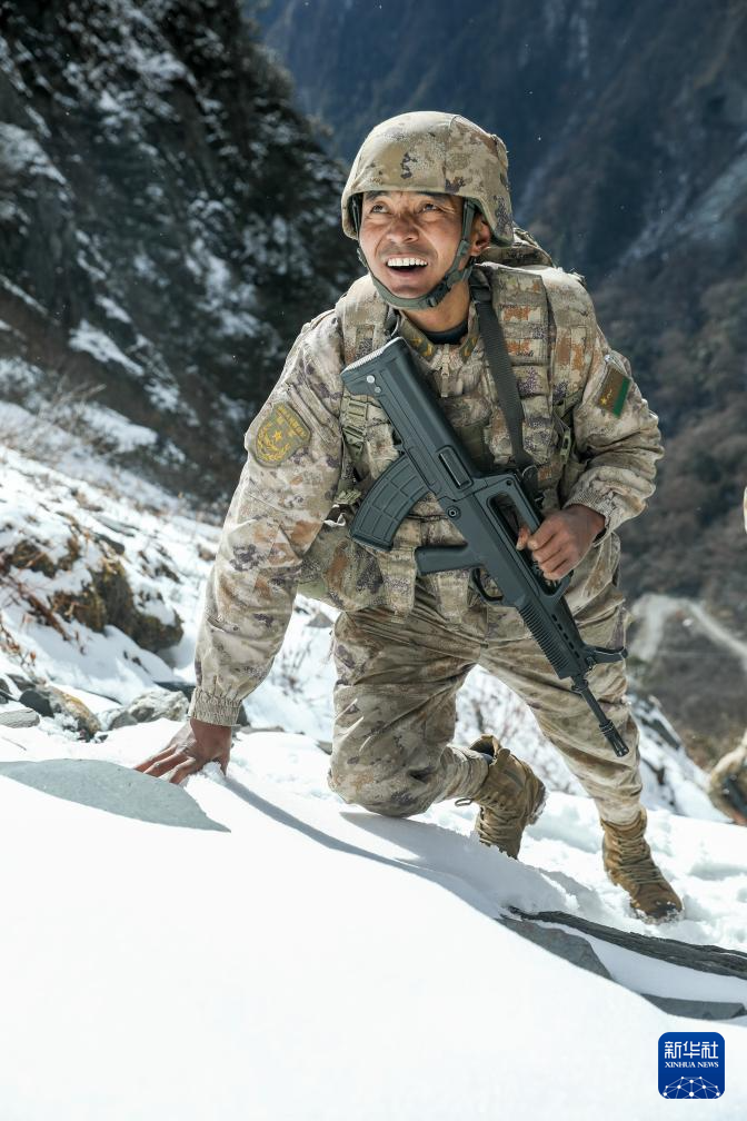 2024年1月5日,巡邏途中,西藏軍區(qū)某團(tuán)一級(jí)上士次羅布和戰(zhàn)友們翻越雪山。新華社發(fā)(張照杰 攝)