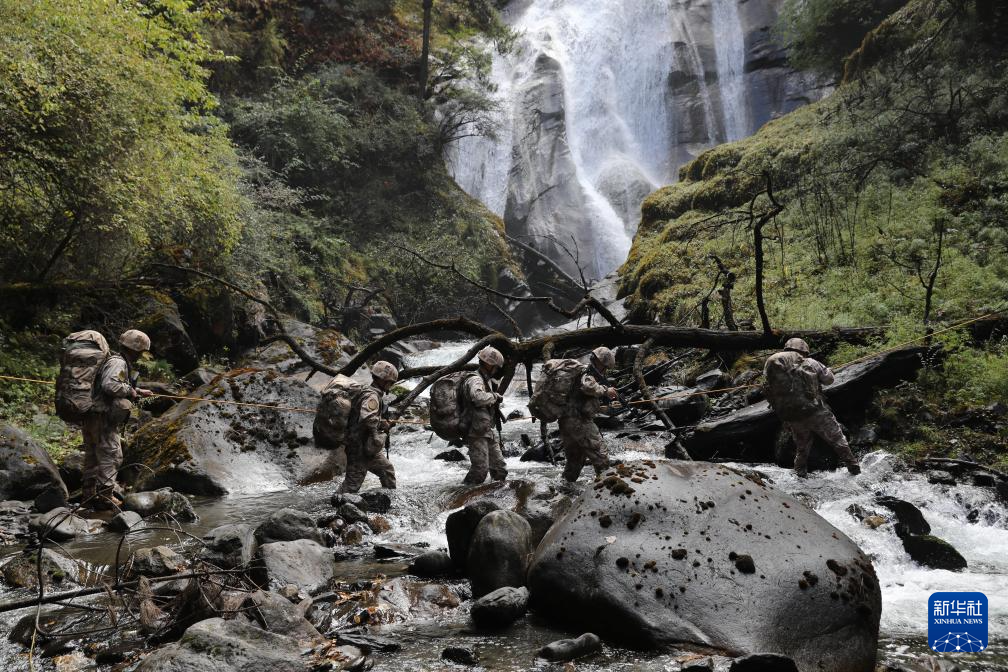 2025年11月2日,巡邏途中,西藏軍區(qū)某團(tuán)一級(jí)上士次羅布(右一)和戰(zhàn)友們跋山涉水。新華社發(fā)(于達(dá) 攝)
