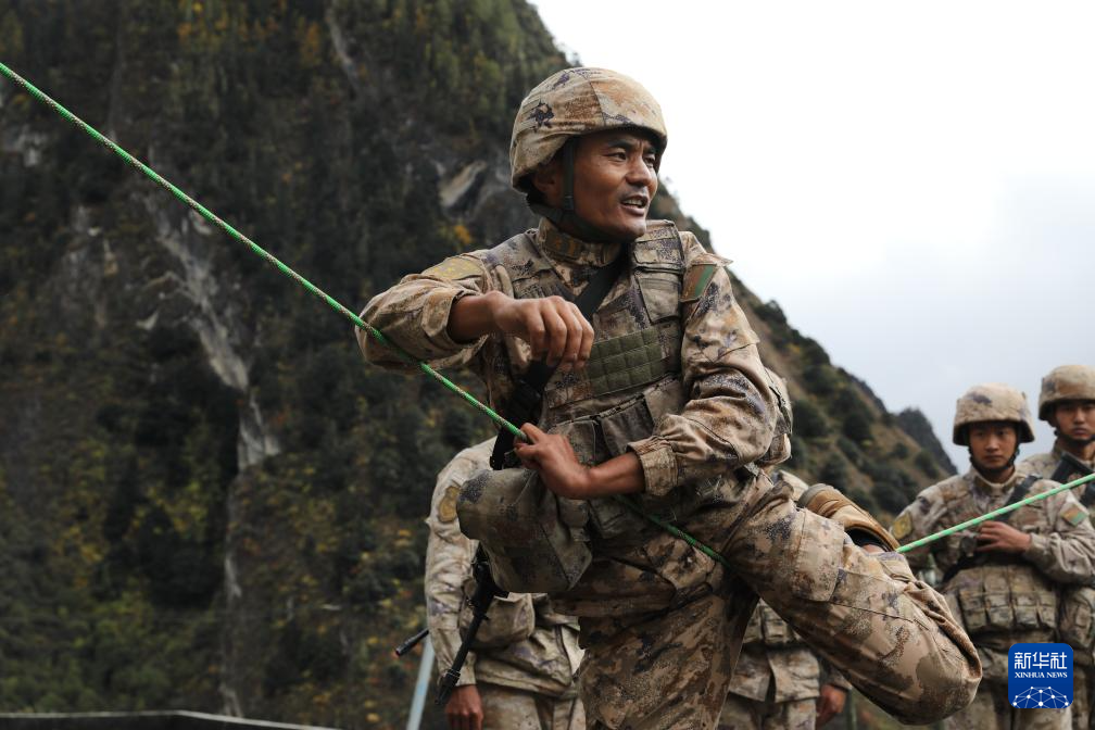 2025年11月1日,西藏軍區(qū)某團(tuán)一級(jí)上士次羅布給戰(zhàn)友示范戰(zhàn)術(shù)動(dòng)作。新華社發(fā)(于達(dá) 攝)