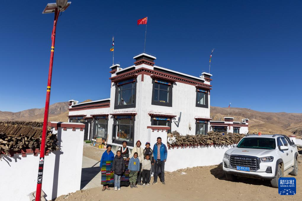 西藏定日縣曲洛鄉(xiāng)熱木青村村民尼瑪平措(右一)一家在新房和自家的汽車(chē)前拍照(11月12日攝)。新華社記者 姜帆 攝
