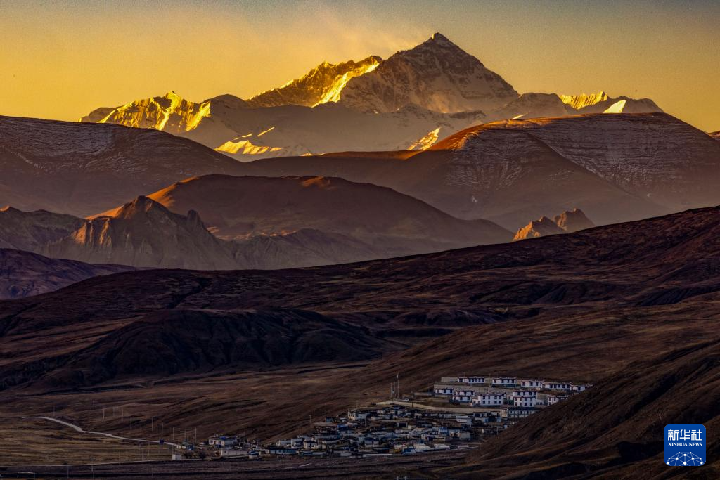 日出時(shí)分拍攝的西藏定日縣協(xié)格爾鎮(zhèn)查那村,村中地勢(shì)較高處為建成并交付使用的新房(11月13日攝)。新華社記者 姜帆 攝