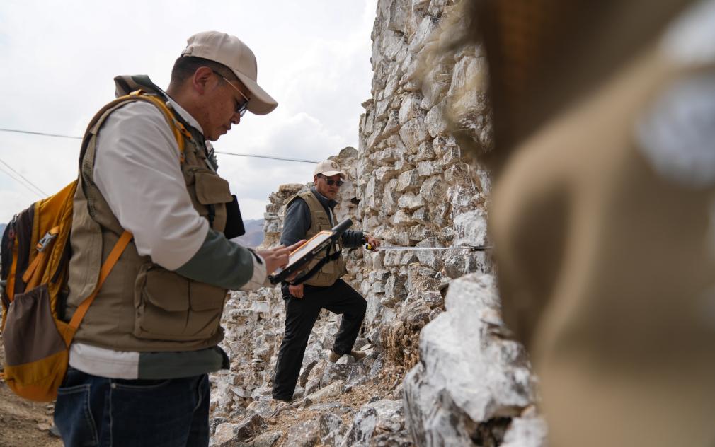 普查隊(duì)員在西藏墨竹工卡縣曲果崗塔群遺址現(xiàn)場(chǎng)開展數(shù)據(jù)采集。(2024年4月11日 攝) 新華社記者 晉美多吉 攝
