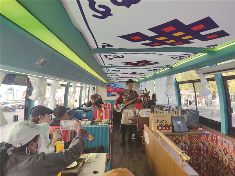 游客筱康從成都專程來到拉薩,通過網(wǎng)絡(luò)平臺了解到這輛觀光巴士后,毫不猶豫地購買車票前來體驗(yàn)。坐上巴士,窗外的風(fēng)景如同一幅流動的畫卷,隨著車輪的前行緩緩展開。八廓商城的熱鬧繁華、布達(dá)拉宮的雄偉壯觀、拉薩河的寧靜秀麗、遠(yuǎn)處落日的余暉灑在大地上,川流不息的人群穿梭其中,側(cè)耳傾聽是城市的低語,煙火氣縈繞良久。而低頭品嘗著現(xiàn)做的美食,熱氣氤氳間,他深深感受到了這座城市的溫柔與魅力。筱康興奮地說:“我覺得這次體驗(yàn)感簡直太棒了!觀光巴士沿著拉薩主城區(qū)的路線行駛,沿途可以看到大昭寺、布達(dá)拉宮、羅布林卡、拉薩河、南山公園等眾多美麗的風(fēng)景。更重要的是,車上還可以品嘗到現(xiàn)做的美食,喝著甜茶,欣賞著特色節(jié)目,還能親眼看到工作人員制作酥油茶、甜茶的過程,品嘗青稞爆米花,這種全新的體驗(yàn)真的非常值得推薦!”