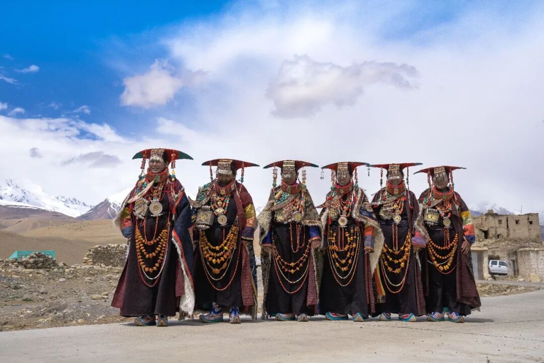 這些服飾上的花紋、顏色和裝飾品都有特定寓意,記錄著普蘭悠久的歷史和與周邊地區(qū)的文化交流,被譽(yù)為“穿在身上的史詩”。這套服飾雍容華貴,單是穿戴就要一個多小時。地處貿(mào)易要道的普蘭人,將遙遠(yuǎn)的珊瑚、黃金、蜜蠟、白銀、綠松石、珍珠全都裝飾在“宣”服上,展示著對這襲錦袍的無比珍視。