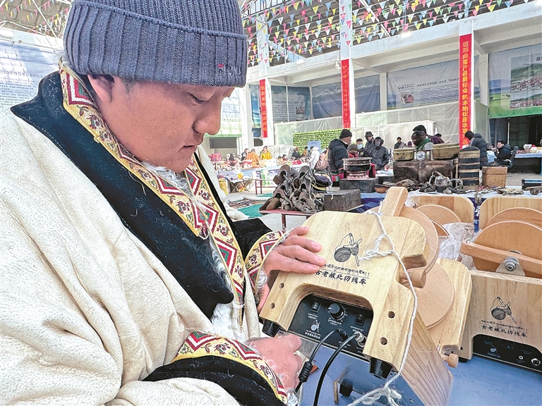 展銷商正在展示自己的新發(fā)明“古老藏北紡線車”。記者 萬(wàn)靖 攝
