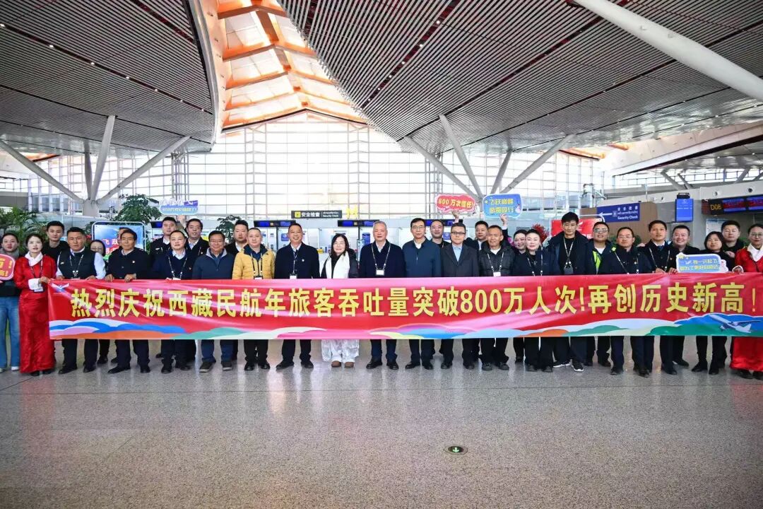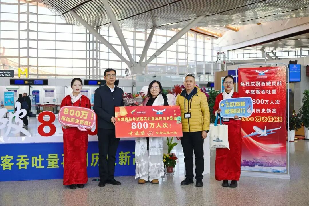圖為當(dāng)天在拉薩貢嘎國際機(jī)場抽取了第800萬名的幸運(yùn)旅客與工作人員合影