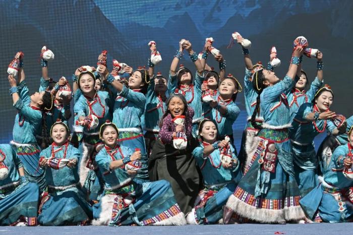 2025年11月2日,西藏自治區(qū)“大地歡歌 格桑花演出季”全區(qū)縣(區(qū))藝術(shù)團(tuán)惠民演出活動在拉薩市堆龍德慶區(qū)民族團(tuán)結(jié)主題公園上演。圖為昌都市邊壩縣藝術(shù)團(tuán)表演女子群舞《糌粑揉出幸福情》。中新社記者 貢嘎來松 攝