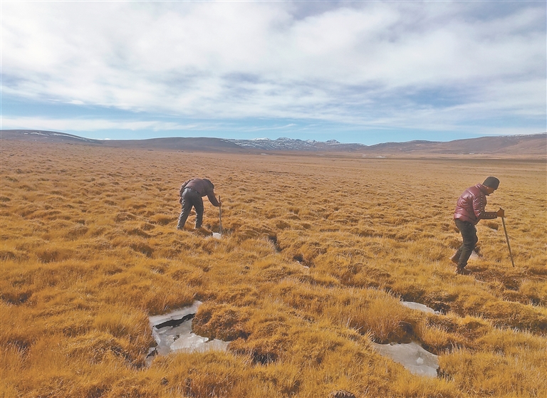 圖為聶榮縣查當鄉(xiāng)瑪布村生態(tài)管護員正在敲碎草原上的冰層。 遲巴加 提供