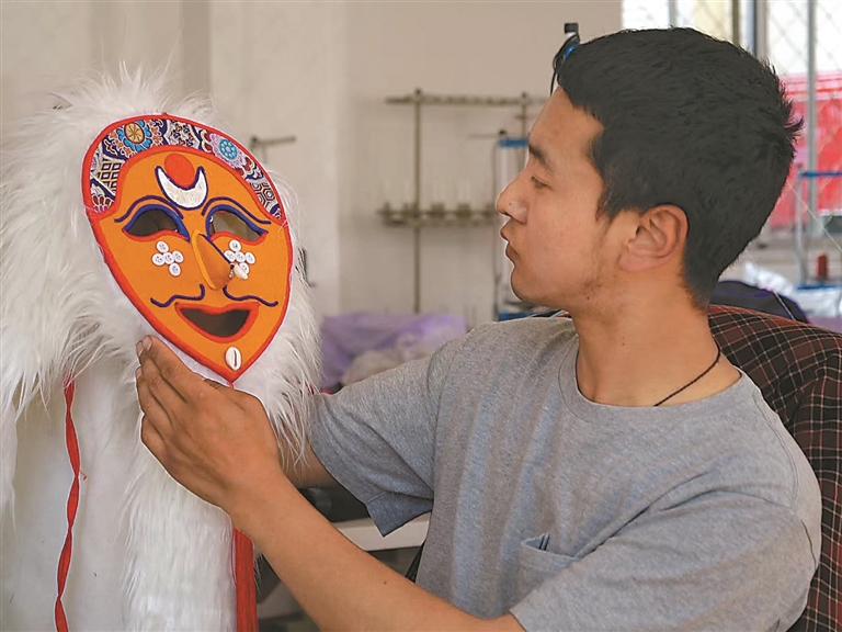 米瑪堅才在仔細(xì)端詳剛制作的藏戲面具。