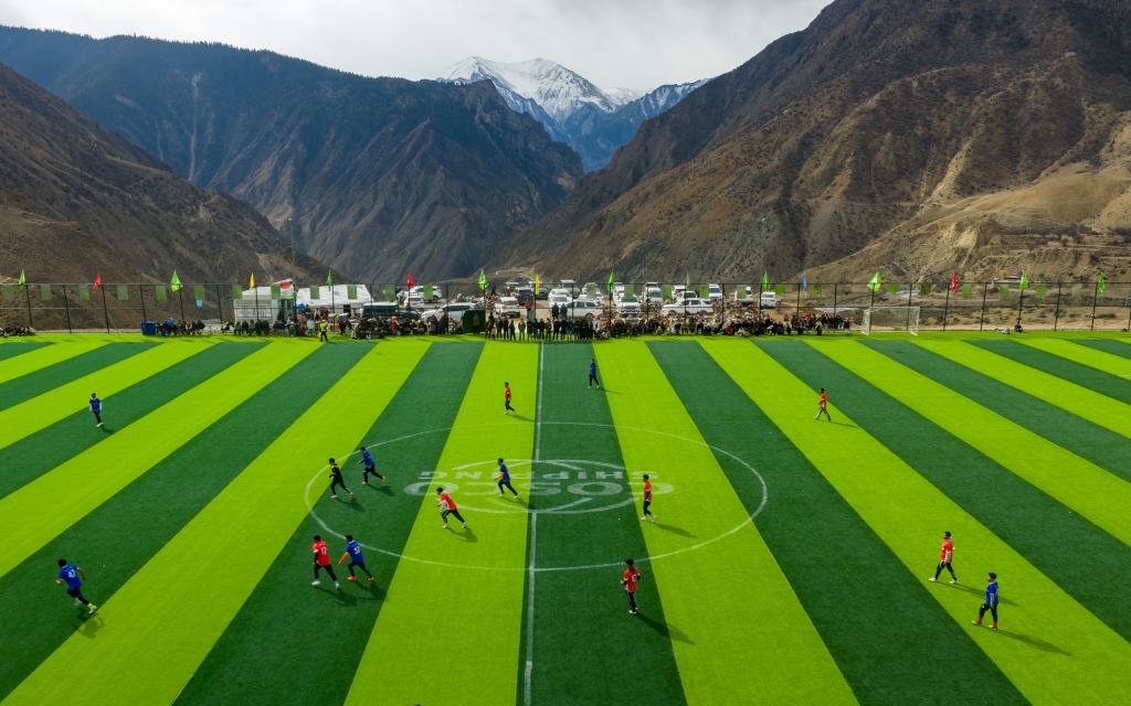 夢想終有回響。2024年,洛隆縣與對口支援企業(yè)中國遠洋海運集團一道在土球場附近,投資200余萬元建成一座占地8000余平方米的11人制標準足球場,當年12月順利竣工,被當?shù)厝擞H切喚作“云上球場”。
