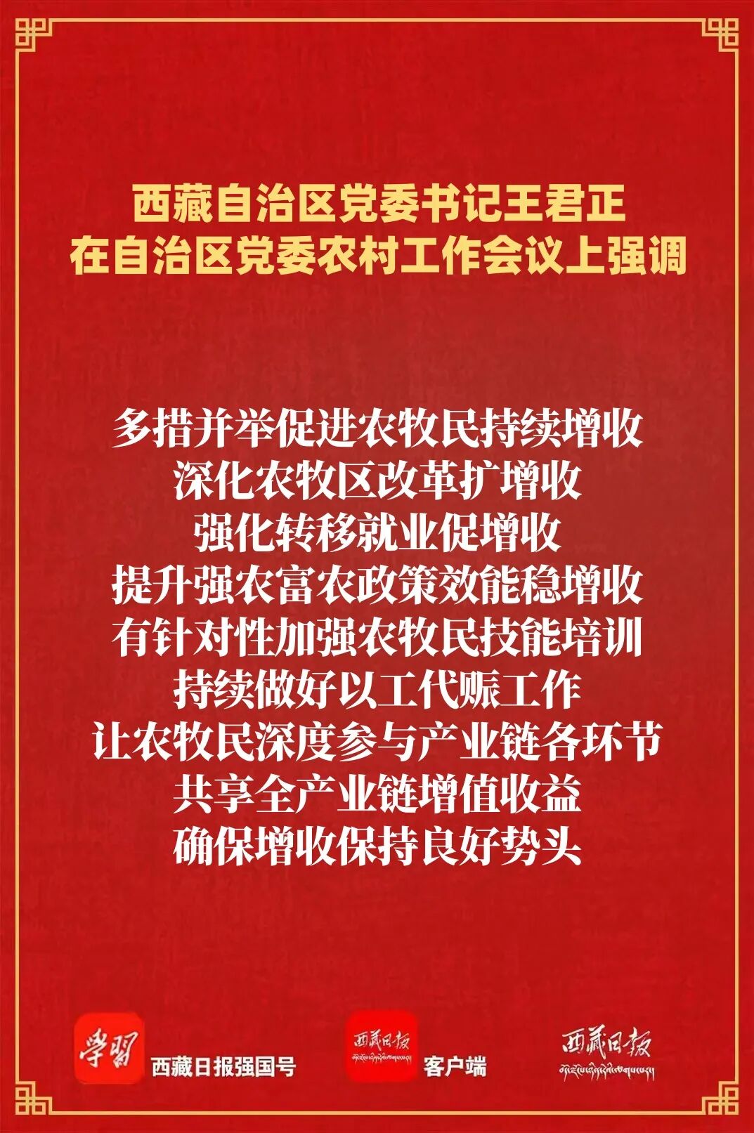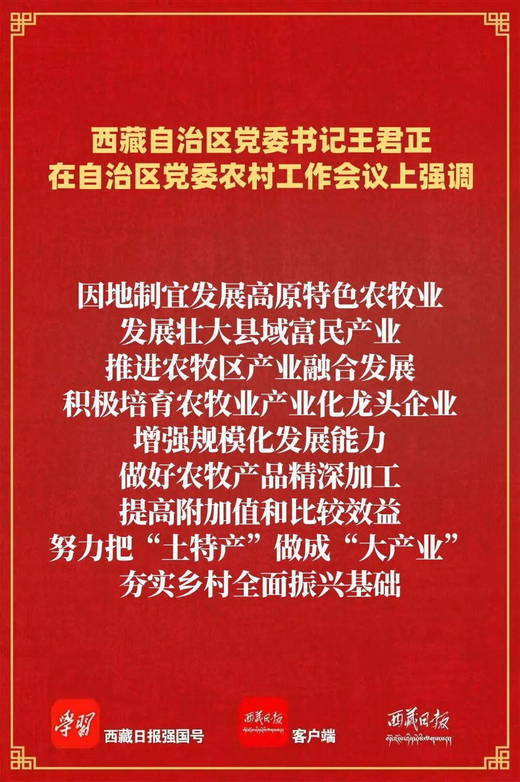王君正強調(diào),要錨定目標任務(wù),突出工作重點,努力開創(chuàng)我區(qū)農(nóng)業(yè)農(nóng)村現(xiàn)代化、鄉(xiāng)村全面振興新局面。高度重視“三農(nóng)”工作,深刻認識做好“三農(nóng)”工作是全面建設(shè)社會主義現(xiàn)代化新西藏、持續(xù)抓好“四件大事”落實、鞏固黨在西藏的執(zhí)政根基的必然要求,大力支持“三農(nóng)”工作,努力實現(xiàn)全區(qū)農(nóng)業(yè)基礎(chǔ)更加穩(wěn)固、農(nóng)村地區(qū)更加繁榮、農(nóng)民生活更加紅火。多措并舉促進農(nóng)牧民持續(xù)增收,深化農(nóng)牧區(qū)改革擴增收,強化轉(zhuǎn)移就業(yè)促增收,提升強農(nóng)富農(nóng)政策效能穩(wěn)增收,有針對性加強農(nóng)牧民技能培訓(xùn),持續(xù)做好以工代賑工作,讓農(nóng)牧民深度參與產(chǎn)業(yè)鏈各環(huán)節(jié),共享全產(chǎn)業(yè)鏈增值收益,確保增收保持良好勢頭。大力實施常態(tài)化精準幫扶,及時精準做好監(jiān)測識別,分類做好常態(tài)化幫扶,筑牢兜底保障防線,堅持把產(chǎn)業(yè)幫扶作為根本措施,優(yōu)化產(chǎn)業(yè)幫扶方式,不斷提升幫扶實效,確保不發(fā)生規(guī)模性返貧致貧。著力提升糧食和重要農(nóng)產(chǎn)品產(chǎn)能,毫不放松抓好糧食特別是青稞生產(chǎn),加強耕地保護和高標準農(nóng)田建設(shè),加強畜牧業(yè)和“菜籃子”產(chǎn)品生產(chǎn)供給,強化農(nóng)牧業(yè)科技賦能,加大氣象監(jiān)測預(yù)報預(yù)警力度,增強農(nóng)牧業(yè)防災(zāi)減災(zāi)能力。因地制宜發(fā)展高原特色農(nóng)牧業(yè),發(fā)展壯大縣域富民產(chǎn)業(yè),推進農(nóng)牧區(qū)產(chǎn)業(yè)融合發(fā)展,積極培育農(nóng)牧業(yè)產(chǎn)業(yè)化龍頭企業(yè),增強規(guī)?;l(fā)展能力,做好農(nóng)牧產(chǎn)品精深加工,提高附加值和比較效益,努力把“土特產(chǎn)”做成“大產(chǎn)業(yè)”,夯實鄉(xiāng)村全面振興基礎(chǔ)。加快推進高原和美鄉(xiāng)村建設(shè),深入學(xué)習(xí)運用“千萬工程”經(jīng)驗,加快農(nóng)牧區(qū)基礎(chǔ)設(shè)施建設(shè),提高教育、醫(yī)療、社保等公共服務(wù)水平,持續(xù)整治提升農(nóng)牧區(qū)人居環(huán)境,把農(nóng)牧區(qū)建設(shè)得更加宜居宜業(yè)。提高鄉(xiāng)村治理水平,持續(xù)加強黨建引領(lǐng),充分發(fā)揮基層黨組織戰(zhàn)斗堡壘作用,深化文明鄉(xiāng)風(fēng)建設(shè),推動形成向上向善的鄉(xiāng)村道德風(fēng)尚;堅持和發(fā)展新時代“楓橋經(jīng)驗”,不斷提升基層治理體系和治理能力現(xiàn)代化水平,確保農(nóng)牧區(qū)持續(xù)和諧穩(wěn)定。