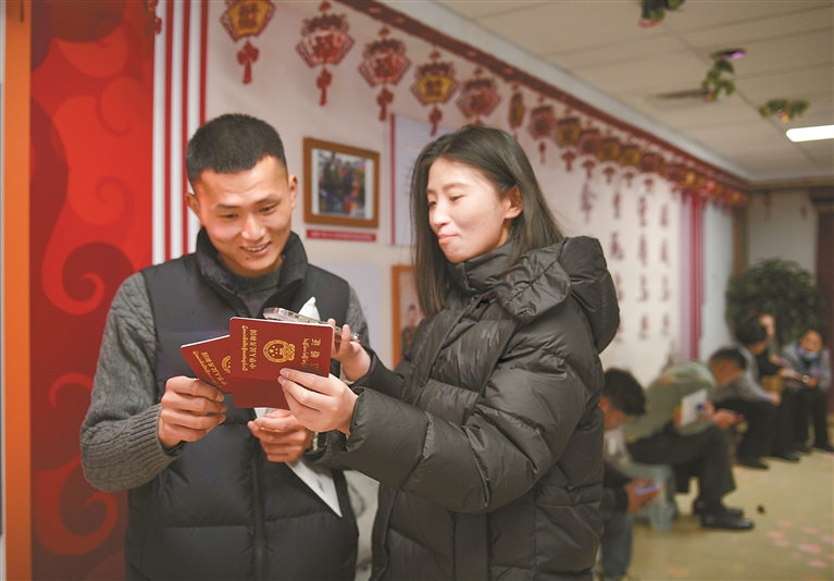 記者在現場看到,婚姻登記處呈現出一派繁忙卻又溫馨的景象:有的情侶在取號機前井然有序地取號排隊;有的正認真填寫登記所需信息;還有的剛領取到結婚證,手捧紅色證書,或是相互依偎,或是與同行的親朋好友合影留念,笑容中滿是甜蜜與幸福。