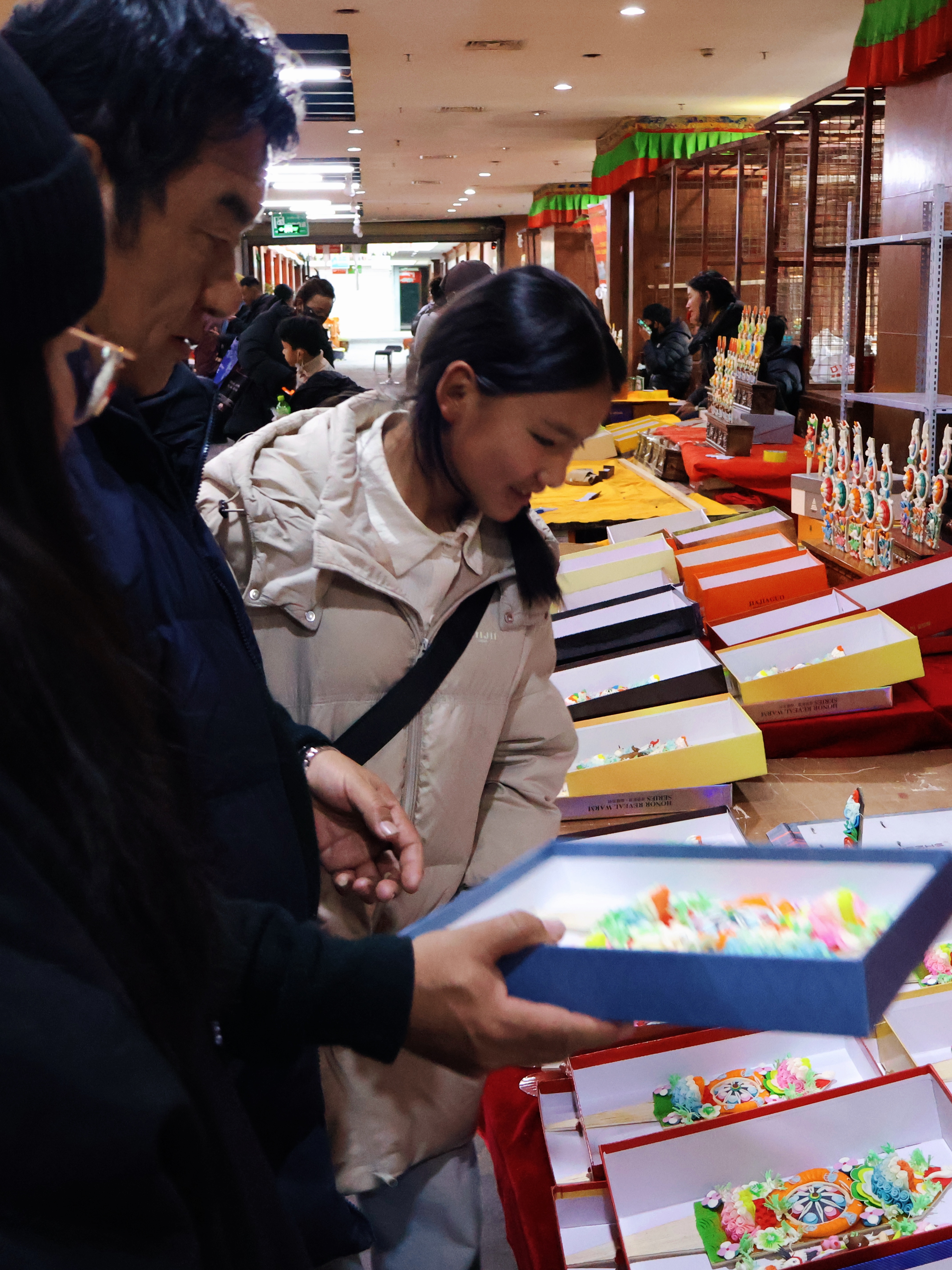 商家拉姆的攤位前,色彩艷麗、造型精美的酥油花整齊擺放,佛像、吉祥八寶、花卉鳥獸等造型栩栩如生,吸引著市民駐足挑選、詢價購買。她忙著為顧客打包酥油花,不亦樂乎。