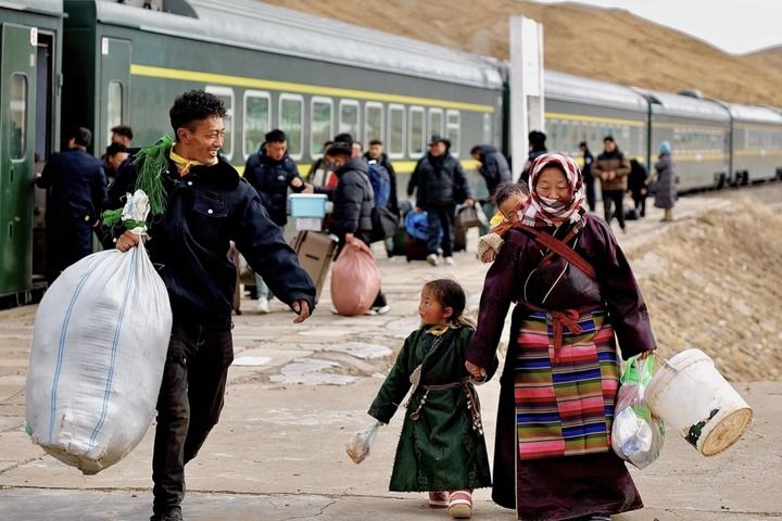 “妻子帶著兩個(gè)女兒在那曲上學(xué),我去接她們回來過年?,F(xiàn)在能在家門口上火車方便多了,我們護(hù)路的工作干得也更有勁頭?!鼻镉X說。