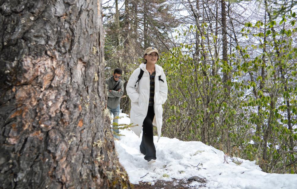 3月21日清晨,記者抵達(dá)白普隆溝的徒步起點(diǎn)。通往牧場的小路被白雪覆蓋,遠(yuǎn)處傳來融冰后流水的嘩嘩聲,雪峰在云霧中若隱若現(xiàn),同行的游客拉開登山杖,戴上冷帽、雪套,準(zhǔn)備踏入這山谷深處。