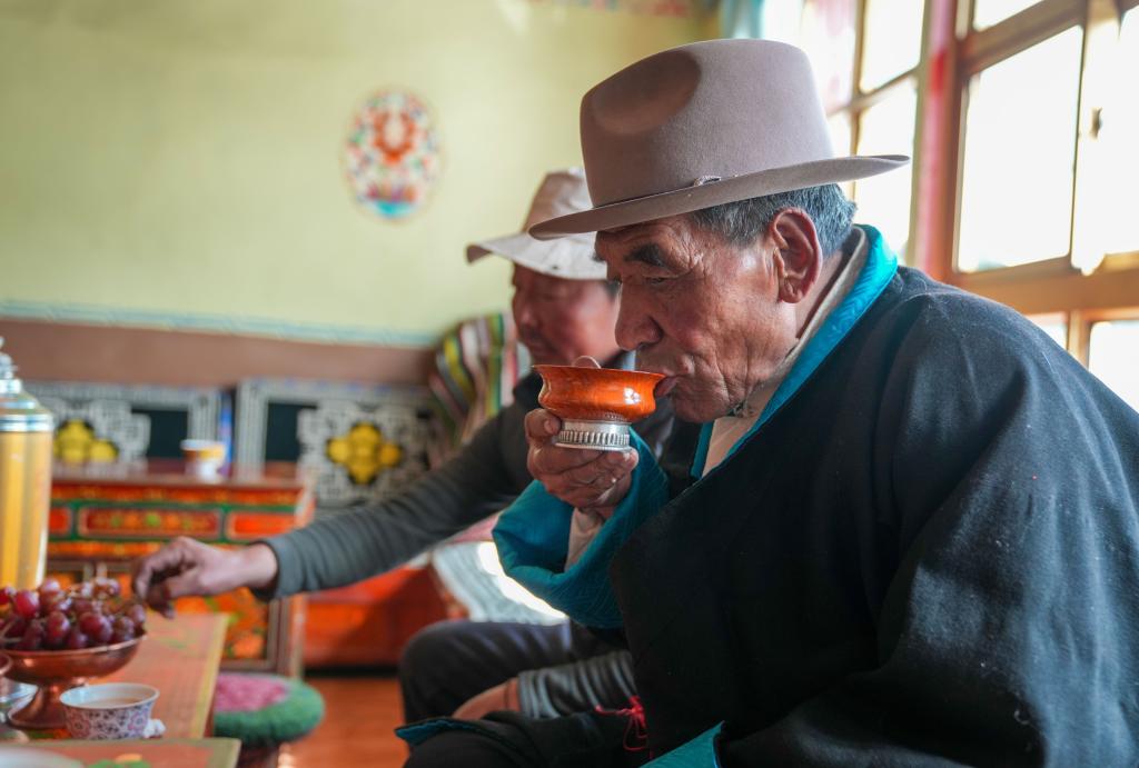 達(dá)瓦片多在家中喝酥油茶(3月12日攝)。