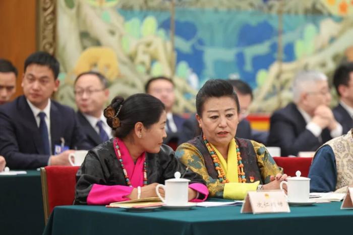 3月6日,十四屆全國(guó)人大四次會(huì)議西藏代表團(tuán)舉行開(kāi)放團(tuán)組會(huì)議。圖為會(huì)前,全國(guó)人大代表次仁措姆(左)和格桑卓瑪交流。