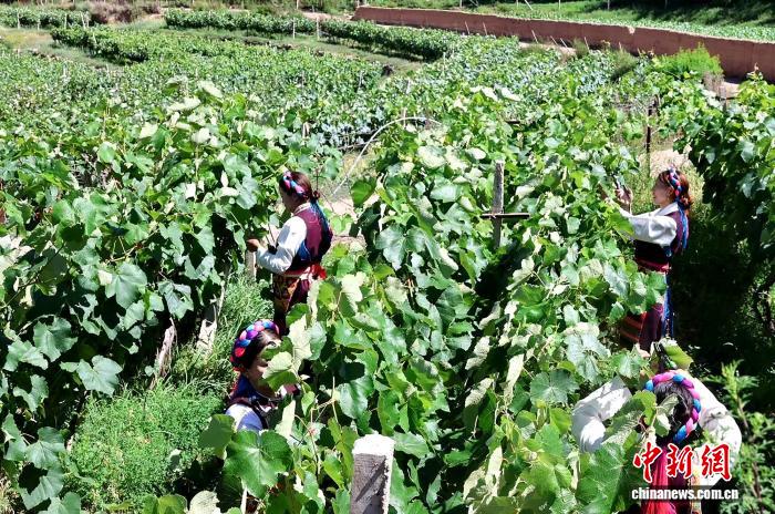 2025年夏天,工人們在西藏芒康縣一葡萄園里進行夏季管理。(受訪者供圖)