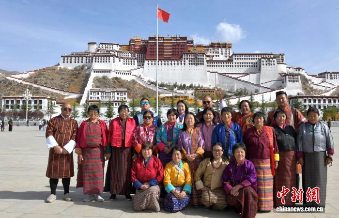 圖為4月22日,來自不丹的游客在西藏拉薩布達拉宮廣場合影留念。中新社記者 李林 攝