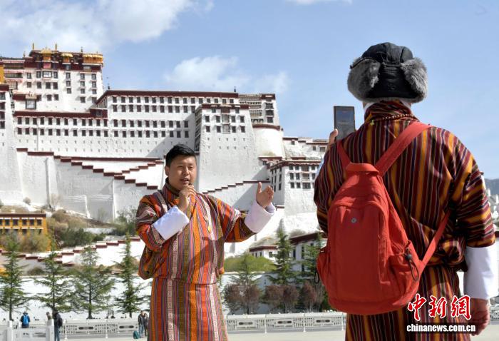 隨著氣溫回暖,雪域高原迎來游客出行高峰,中外游客在布達拉宮廣場等地游覽參觀。圖為4月22日,來自不丹的游客在西藏拉薩布達拉宮廣場拍照留念。中新社記者 李林 攝