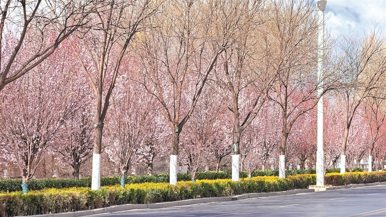 除軍民路外,慈松塘路、貢布堂路、濱河路、羅堆西路、區(qū)直工委路、娘熱北路、農(nóng)科路等道路兩側(cè),紫葉李、桃花也競(jìng)相綻放。一路走來(lái),道路兩側(cè)的花木被春季染上新的碧綠與粉紅,就連公交車(chē)站都被花朵裝點(diǎn)得浪漫雅致,宛如鮮花簇?fù)淼男∥枧_(tái)。