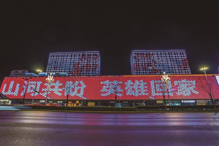 柳梧萬(wàn)達(dá)大屏顯示“山河共盼 英雄回家”字幕。