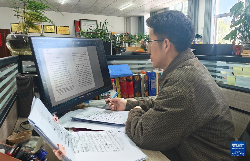 仁青正在校勘《茶經》藏譯本。新華社記者春拉 攝