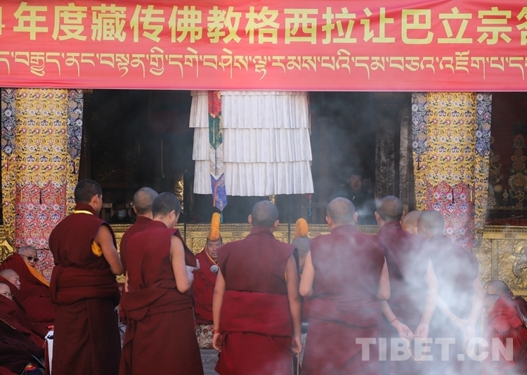 當(dāng)日上午9時(shí),立宗答辯儀式正式開(kāi)始,儀式由藏傳佛教學(xué)經(jīng)僧人考取格西拉讓巴學(xué)位考評(píng)委員會(huì)主持。按照傳統(tǒng)慣例,先舉行無(wú)齋佛事活動(dòng),在考評(píng)委員會(huì)的監(jiān)考下,應(yīng)考格西拉讓巴學(xué)位的12名考僧輪流答辯陪考僧眾所提有關(guān)《釋量論》《般若學(xué)》《中觀學(xué)》《俱舍論》《戒學(xué)》五部經(jīng)典方面的內(nèi)容。立宗答辯儀式結(jié)束后,所有參加答辯儀式的僧人集體誦經(jīng)祈禱,同時(shí)供齋茶齋飯。齋后,由西藏自治區(qū)宗教局負(fù)責(zé)人代表西藏自治區(qū)政府向參加答辯活動(dòng)的僧人發(fā)放布施。