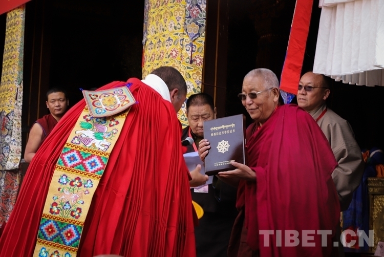 圖為佛協(xié)西藏分會(huì)副會(huì)長(zhǎng)、扎什倫布寺堪布噶欽 多吉堅(jiān)贊向獲得學(xué)位的考僧獻(xiàn)哈達(dá)并頒發(fā)學(xué)位證書(shū) 攝影:賈華加