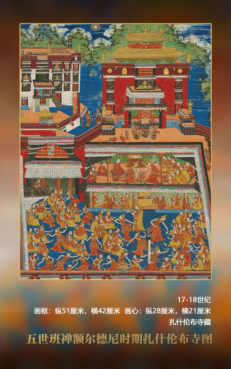 畫面以四世班禪靈塔殿為中心而不及其他,推測其年代應(yīng)為五世班禪時(shí)期。