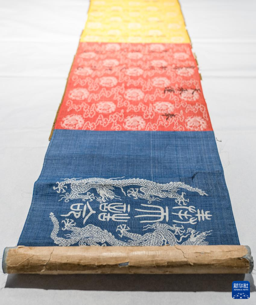 ?這是《永樂十一年封斡喃渴烈思巴為輔教王誥書》卷首(5月20日攝)。篆書“奉天誥命”四個(gè)字和雙龍圖案均是錦緞織造時(shí)應(yīng)用提花技術(shù)以不同色彩的絲線織成。新華社記者 李賀 攝