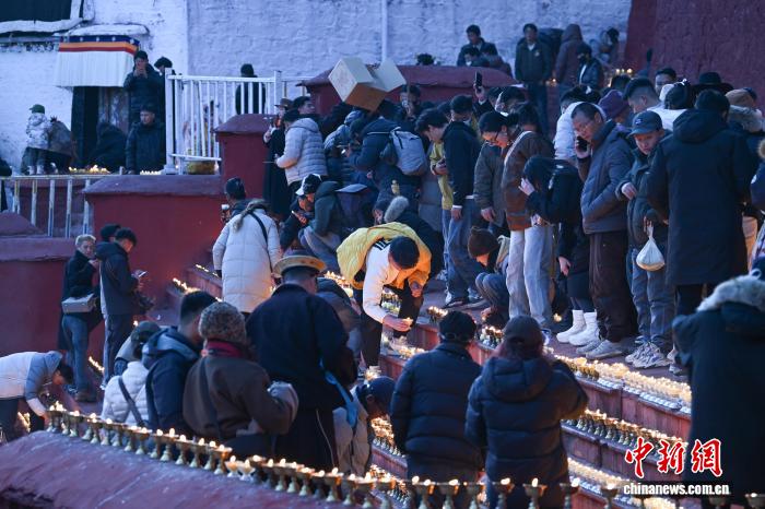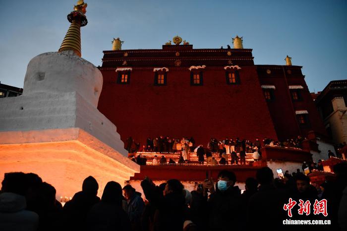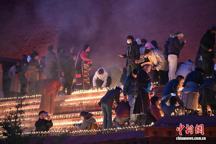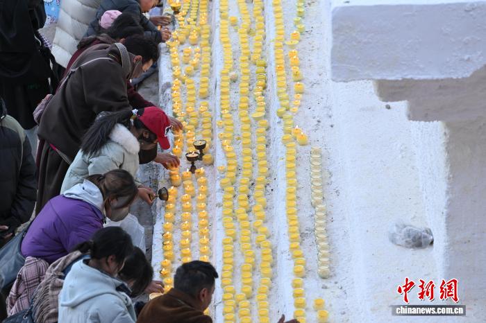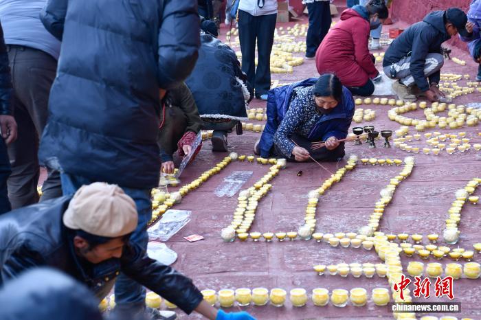 圖為信眾在甘丹寺有序擺放酥油燈。 中新社記者 貢嘎來(lái)松 攝