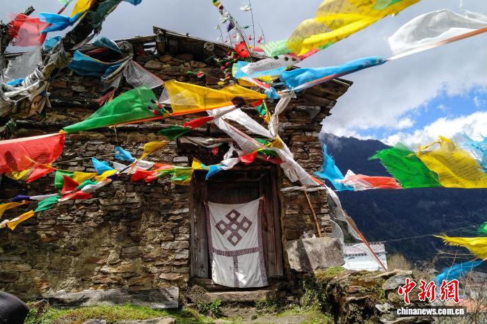 資料圖為位于西藏自治區(qū)山南錯(cuò)那市勒布溝的倉(cāng)央嘉措故居,周圍被藏傳佛教信眾掛滿祈福經(jīng)幡。中新社記者 江飛波 攝