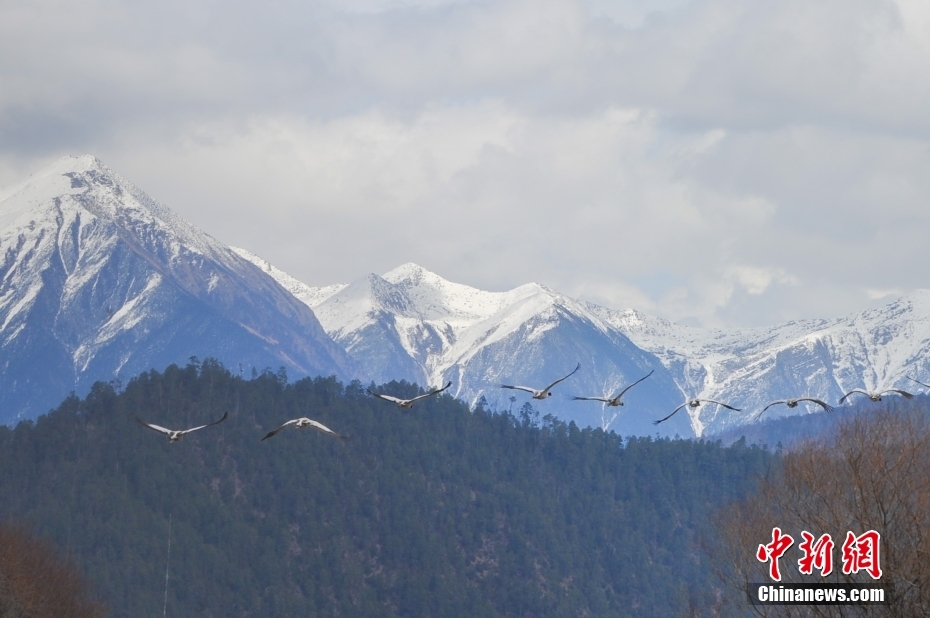 3月30日,在西藏林芝市巴宜區(qū)更章門巴民族鄉(xiāng),黑頸鶴與周邊的村莊、桃花、雪山融為一體,成為春日里的一道靚麗的風(fēng)景線。圖為黑頸鶴在田間覓食嬉戲。 [詳細(xì)]